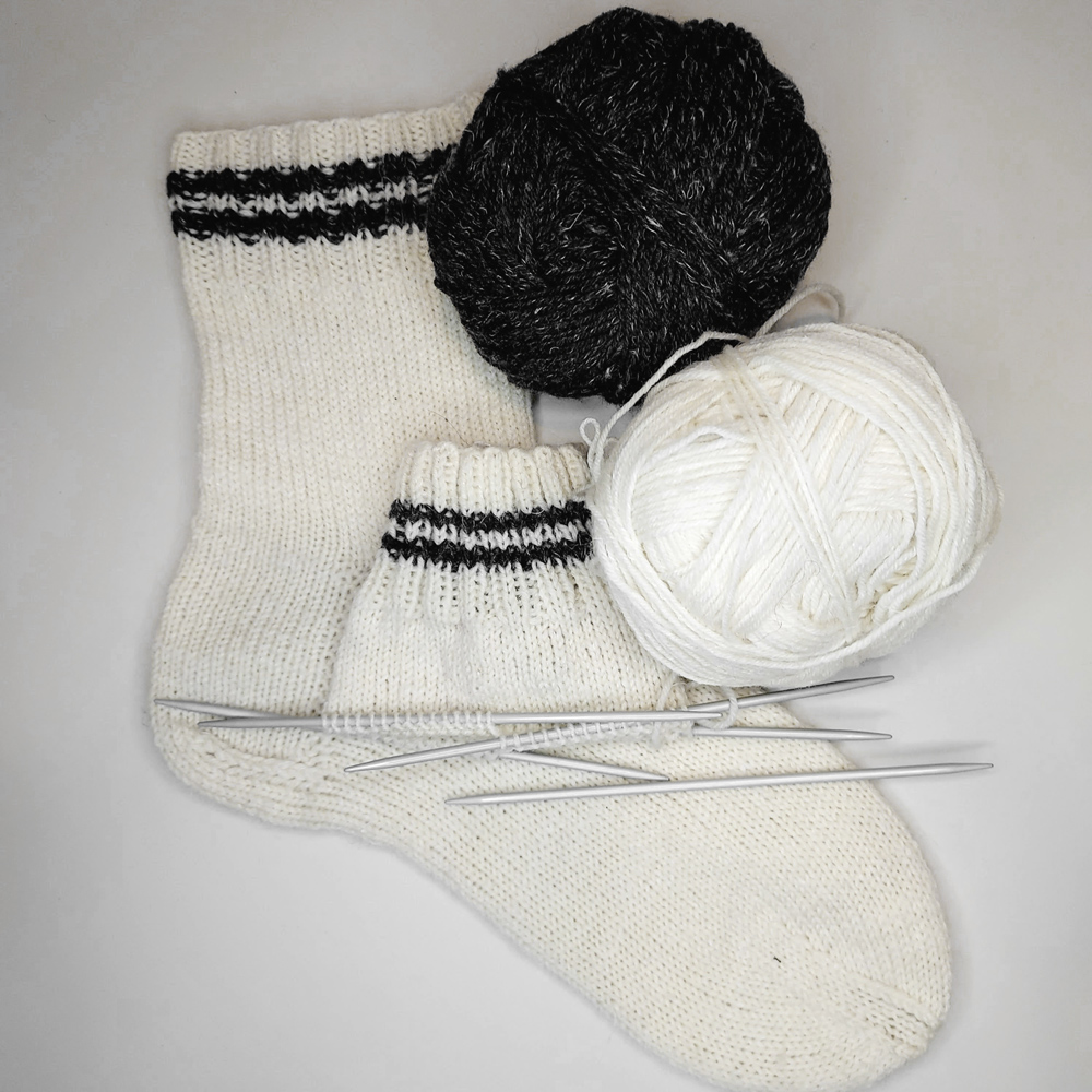 Für die Teilnahme an meinem Kurs solltest Du rechte und linke Maschen flüssig stricken können. Außerdem musst Du zeitliche Kapazitäten haben, um den Sockenschaft zu Hause weiter zu stricken. Deine Vorarbeit endet in etwa da, wo bei deiner Socke der Knöchel ist. Diese Vorbereitung ist wichtig damit wir zum zweiten Treffen mit dem Stricken der Ferse beginnen können.